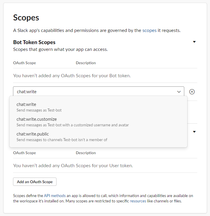 아래에 Scopes 메뉴에, Bot Token Scopes 메뉴에서 권한을 설정해주어야 합니다.