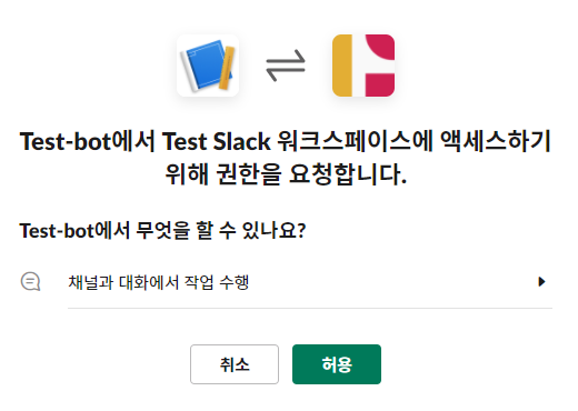 Slack 봇이 워크스페이스에 액세스 허용 권한 요청을 합니다.