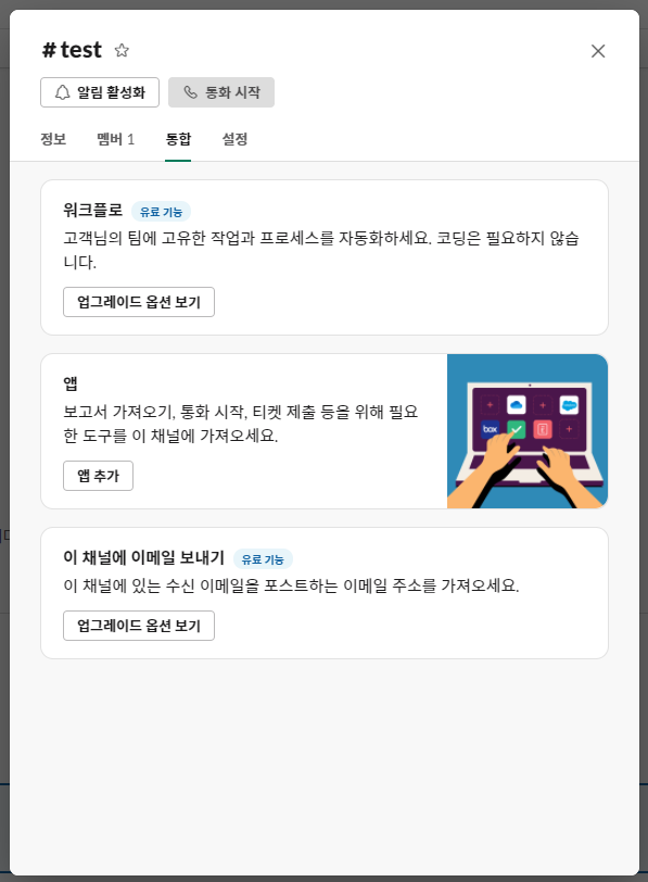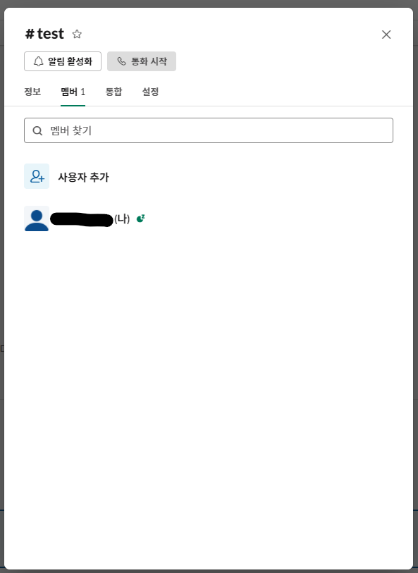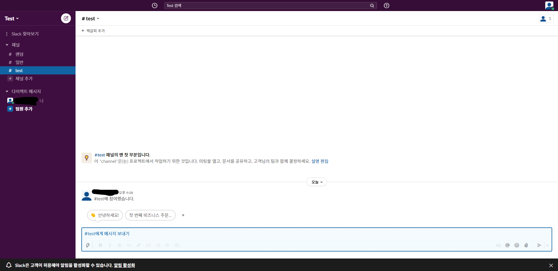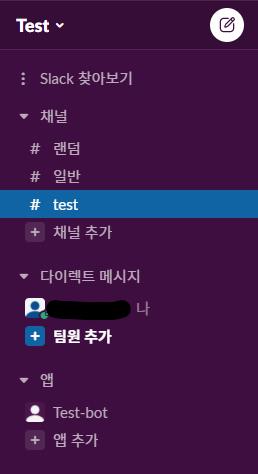 여기서 저는 워크스페이스 채널명이 되는 부분에 test 라고 적어서 채널 이름이 test 입니다.