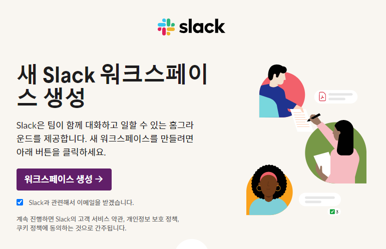 Slack 홈페이지에 들어오시면 오른쪽 위에 새 워크스페이스 생성을 눌러줍니다.