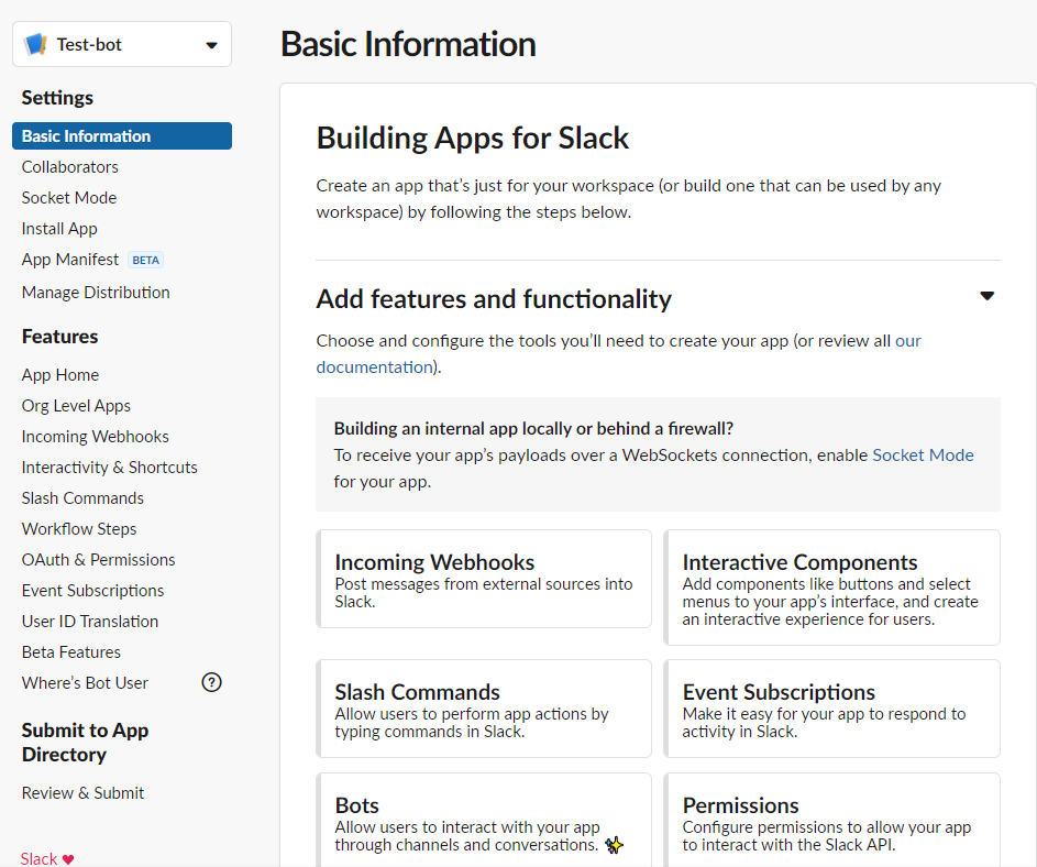 기본 설정을 하셨다면, Slack API의 봇을 설정해줄 수 있는 부분입니다.
