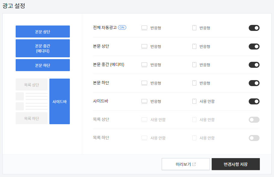 구글 애드센스와 티스토리가 연동이 되었다면, 아래쪽에 광고 설정에서 광고를 어디에 삽입할 건지 정해주실 수 있습니다. 여기서 원하는 광고를 체크해주시고, 변경사항 저장을 눌러주시면 됩니다.