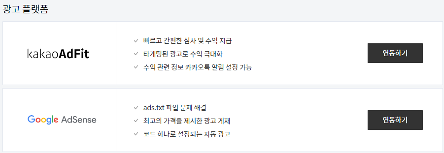 여기서 구글 애드센스 옆에 연동하기를 클릭해줍니다.